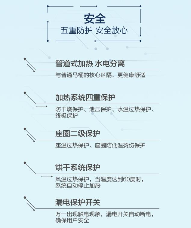 目前黄瓜视频下载污APP在线观看坐便器的质量问题集中在耐燃、耐压、防漏、标识等方面,尤其是其水电结合的特质,器具渗水、漏水容易导致短路。黄瓜视频污下载网站卫浴把安全防护功能当作黄瓜视频下载污APP在线观看坐便器产品的重要性能,通过采用更安全的水电分离技术,既可迅速加热,又起到保护和绝缘的作用;阻燃、防潮、防超温、防超压、防干烧等保护装置,杜绝安全隐患。