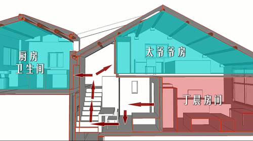 史老师在改造的过程中,运用「二层变四层」的空间错层解决思路,充分利用了小丁当一家“坐卧行驶”的具体需求,把原先的两层空间扩展成了四层空间。在这四层空间中,魔法般的变出了10大功能区、近100个储藏空间,不仅满足了四代人分别拥有自己独立卧室的需要,还设计了独立的客厅、厨房,卫生间从原来与厨房共用改造成了独立卫生间,而且是上下两个独立的卫浴空间,充分照顾到四代人不同的使用需求。