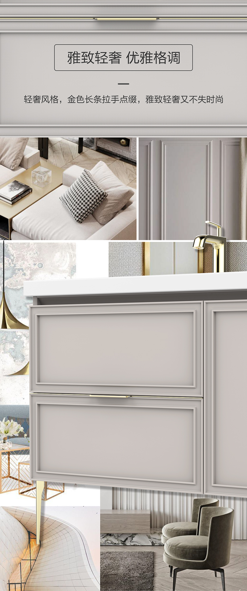 • 轻奢风格,金色长条拉手点缀,雅致轻奢又不失时尚