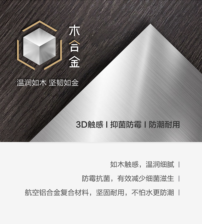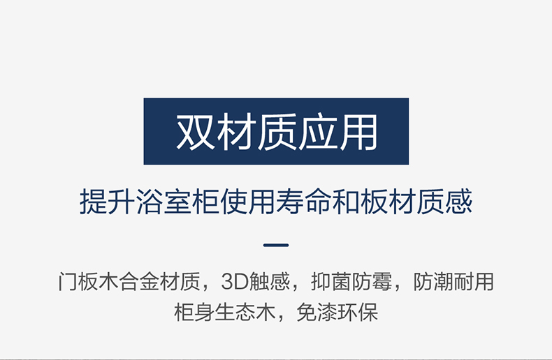 - 2、双材质应用,门板木合金材质,3D触感,抑菌防霉,防潮耐用,柜身生态木,免漆环保