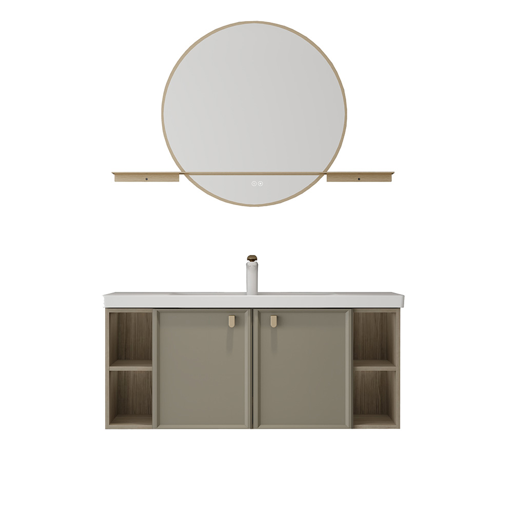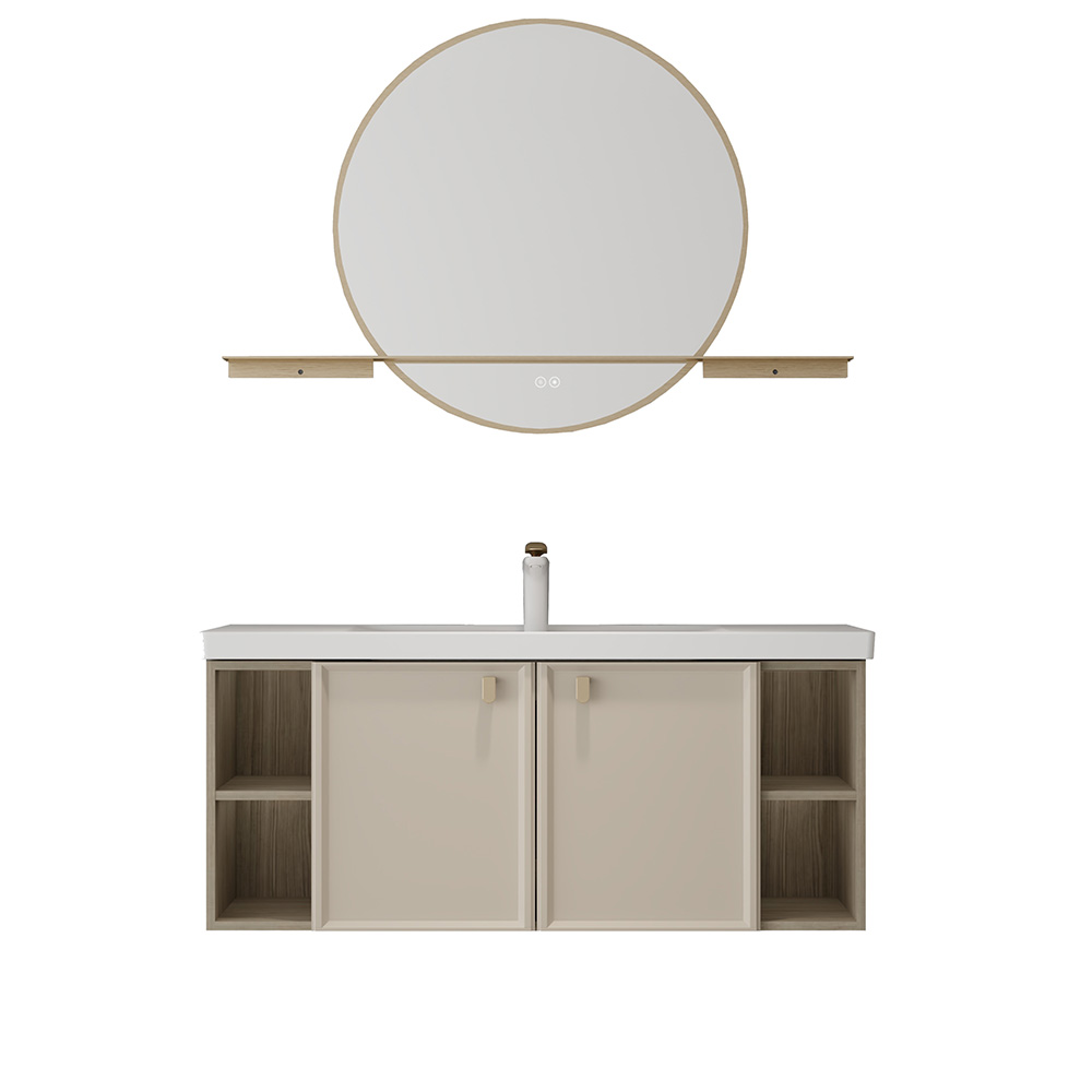 - 新中式设计元素:徽派建筑元素(吸塑造型门板提取马头墙元素,香槟金带纹理造型拉手提取飞檐和琉璃瓦元素),金属包边圆镜搭配触控氛围灯设计,传统与时尚碰撞,呈现新中式格调