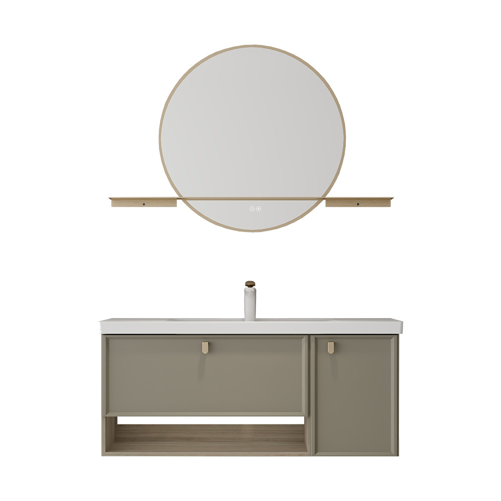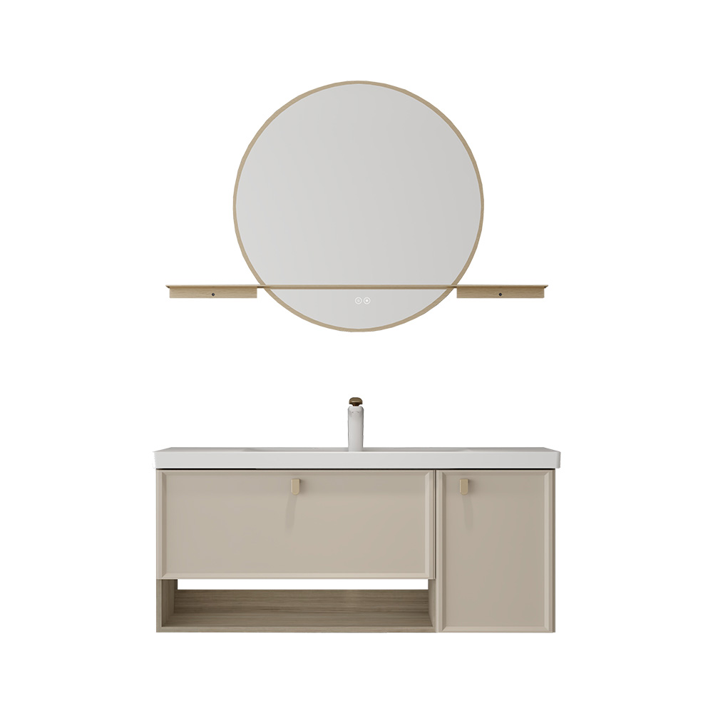 • 新中式设计元素:徽派建筑元素(吸塑造型门板提取马头墙元素,香槟金带纹理造型拉手提取飞檐和琉璃瓦元素),金属包边圆镜搭配触控氛围灯设计,传统与时尚碰撞,呈现新中式格调
