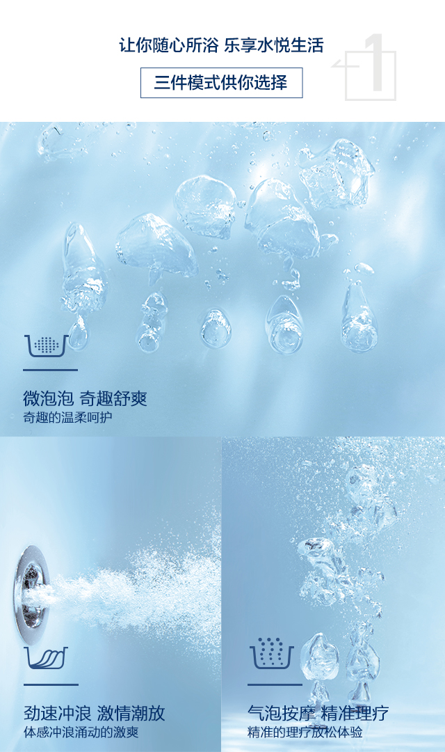• 劲速冲浪按摩系统、微泡泡按摩系统及汽泡按摩系统三件模式供你选择,让你随心所浴,乐享水悦生活